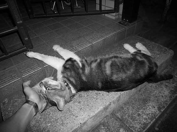 ムサシが冷えたコンクリートの階段で涼んでいました。