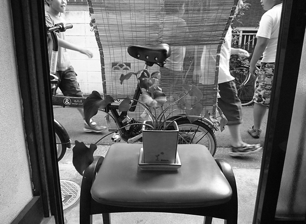 そこには古い竹ヒゴの簾、路地移動に便利な折りたたみ自転車、