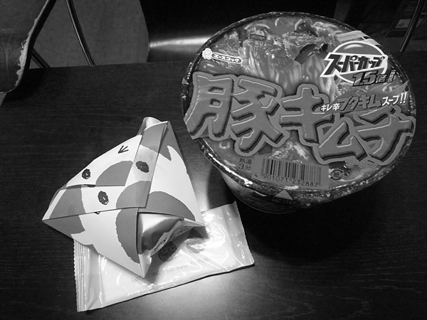 こんな日は久しぶりにカップラーメンしかない、と、近くのローソンまで歩き、スーパーカップの豚キムチと、から揚げ君を購入。