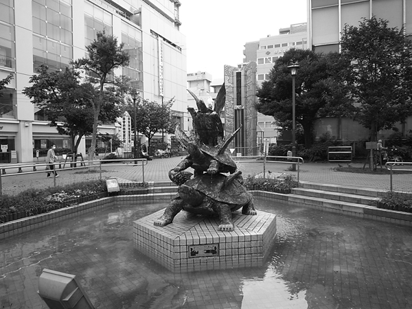 この像は『はね亀』というタイトルで、「亀戸地区が未来にむかってはばたくように…亀戸の亀も、親亀、子亀、孫亀揃って促進を願って大空に向かい羽ばたいています」との事。