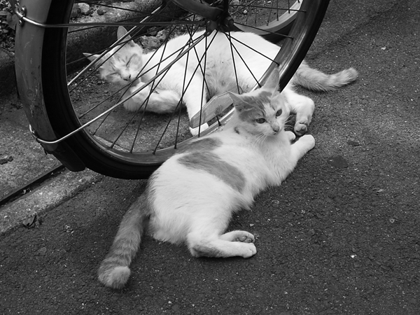 手前のネコはまわりを気にして警戒。奥のネコはそれに安心しきり。