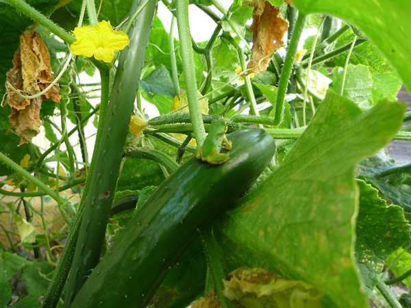 朝、庭の畑に野菜を採りに行くと、大きくなったキュウリやナスが山ほど。