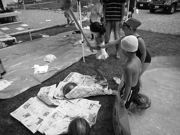 ビニールプールで冷やした後に子供によるスイカ割り。